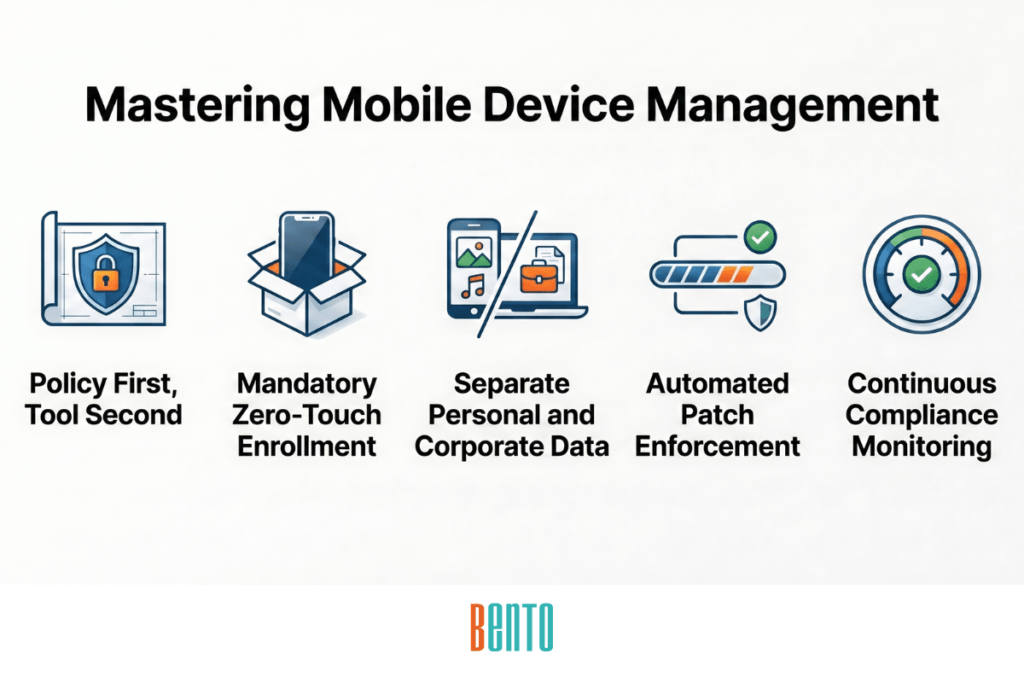 Define your device policy. Before evaluating vendors, document which platforms you manage, which ownership models you support, what compliance frameworks apply, and what your acceptable use rules look like. The policy drives every subsequent decision — vendor selection, enrollment configuration, security settings, and user training. Bento MDM’s setup wizard walks new deployments through policy configuration and zero-touch enrollment setup in under 30 minutes.