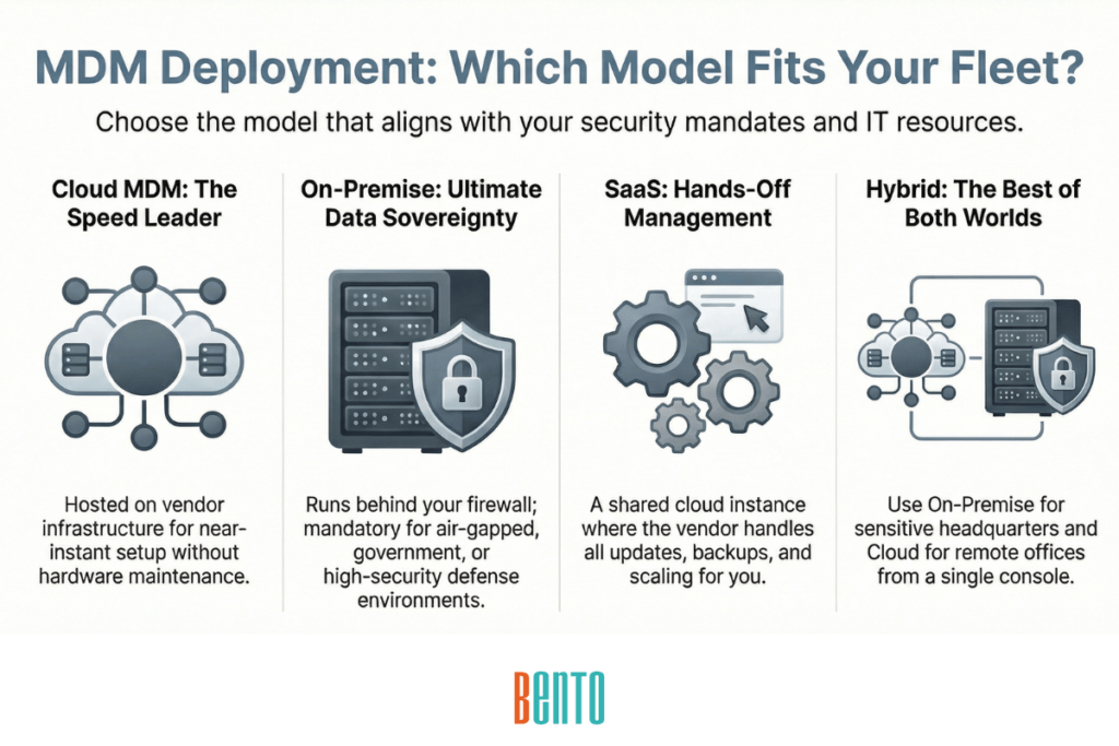 MDM deployment determines where the server runs and who manages the infrastructure. Three models exist, and the right choice depends on your compliance requirements, IT resources, and data sovereignty needs.